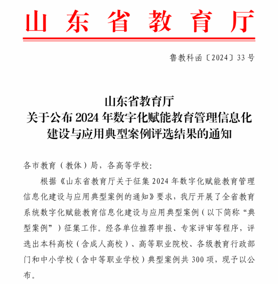 此次荣获山东省2024年数字化赋能教育管理信息化建设与应用典型案例,不仅是对437ccm必赢国际首页欢迎您在教育信息化领域取得成绩的肯定,也为持续推动数字化赋能教学管理提供强劲动力。